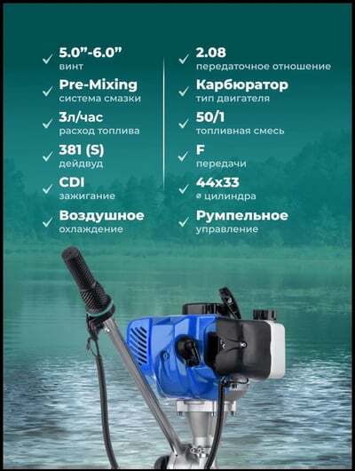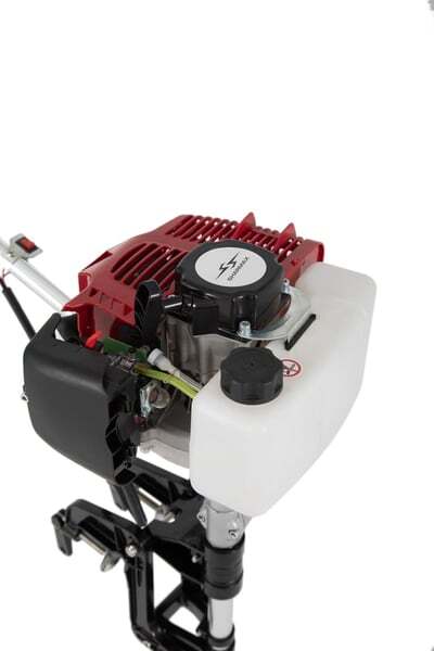 Небольшой вес (8 кг) выгодно отличает эту модель от более громоздких 4-х тактных аналогов. Общая мощность одноцилиндрового двигателя — 3,9 л. с, этого вполне хватит для разгона лодки длиной 2,5 метра. Рекомендуемое количество пассажиров — 1, 2 человека. Полный бак, объёмом 1,2 л, позволит мотору работать на полной мощности долгое время. Благодаря воздушной системе охлаждения в конструкции мотора отсутствует водопомпа, которая имеет свойство забиваться песком. Эта особенность делает мотор более устойчивым к эксплуатации на мелководье или в грязной илистой воде.