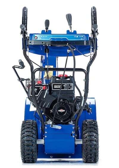 - Металлический желоб выброса с системой быстрого разворота дает возможность просто и моментально менять направление выброса снега на 190 градусов при помощи рукоятки