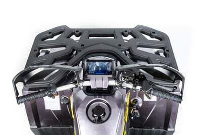 Трансмиссия и ходовая часть квадроцикла представлена прочными разноразмерными шинами, металлическими штампованными колесными дисками, автоматической трансмиссией с реверсом. Модель имеет крупный размер, удобное посадочное место, высокий дорожный просвет (320 мм) и чувствительную тормозную систему. В комплекте идет система автозапуска с дистанционным контролем, которая позволяет завести, заглушить квадроцикл на расстоянии 100 метров. А так же имеется ограничитель скорости, расположенный с правой стороны руля. Стоит принять во внимание и наличие таких опций как: защита рук, удобная широкая и закрытая площадка для ног, расширители колесных арок, передний отбойник, гнездо прикуривателя, спидометр, передние и задние поворотники. Плюс, для любителей зимних прогулок имеется комплект цепей противоскольжения.