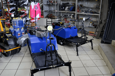 В базе мотобуксировщики комплектуются рогами, а водитель едет в санях за ним. Возможна установка лыжного модуля, колесного модуля для езды летом а также модуля типа «толкач». Подвеска по умолчанию катковая. Возможна адаптивная подвеска, которая позволяет менять базовую катковую на склизовую подвеску или пневмоколеса. Склизовая лучше пойдет по сугробам тогда как пневмоколеса делают мотособаку пригодной к летней эксплуатации для езды по грунтовке или болотам. Задний ход мотобуксировщику обеспечивает коробка реверса.