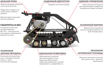 Мотобукс весит 80 кг, а размеры его составляют 100 см в длину, 43 см в ширину и 70 см в высоту. Модель оснащена гусеницей шириной 380 мм. Гусеница в сочетании с катковой подвеской способна проходить спокойно по льду и даже по территории без снега.