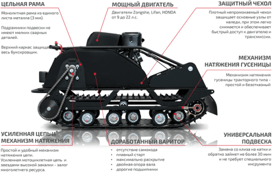 Мотособака оснащена специальной гусеницей Composit, которая обеспечивает отличное сцепление со снегом и со льдом благодаря своим техническим качествам, а также тракторным механизмом натяжения цепи.