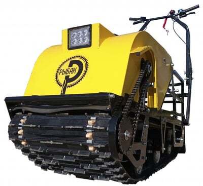 В конструкции мотовездехода используется цельная резиновая гусеница шириной 500 мм. Гусеница в сочетании с катковой подвеской способна проходить спокойно по льду и даже по территории без снега.