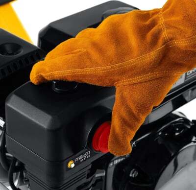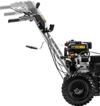 Трансмиссия с фрикционным диском обеспечивает легкую регулировку скорости в широком диапазоне. Колеса 14″ с глубоким рисунком протектора обеспечивают превосходное сцепление с поверхностью и высокую проходимость. Усиленный ковш с дополнительными ребрами жесткости. LED-фара обеспечивает освещение рабочей зоны для работы в темное время суток. Лопатка для очистки желоба и крыльчатки ото льда в комплекте.